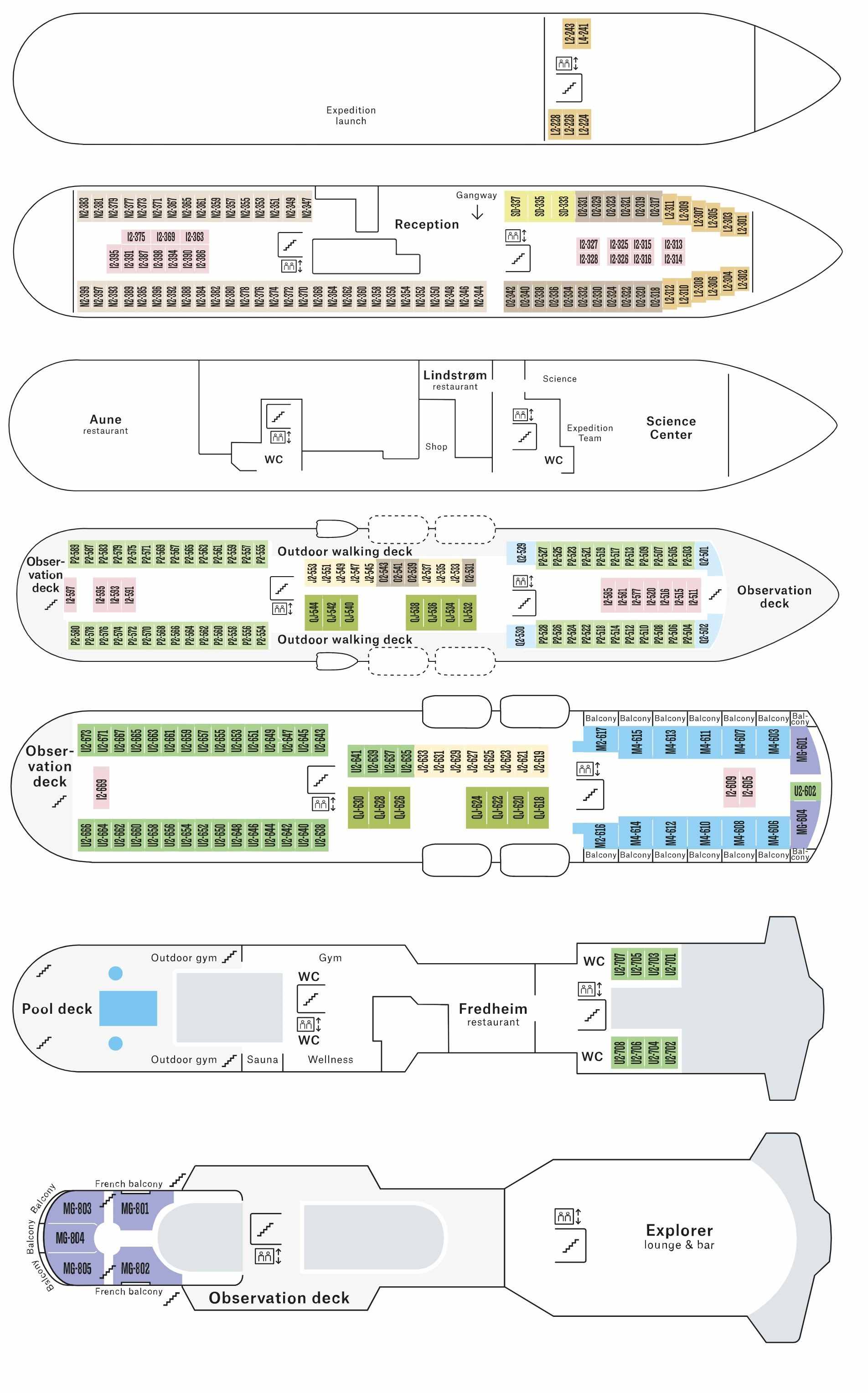 - Vonkajšie kajuty Arctic Superior U2: 10 - 12 m². Neotvárateľné okno; na 6. a 7. palube, kúpeľňa so sprchou a WC, Tv. Manželské alebo oddelené postele.