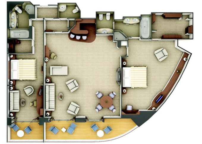 R2 - Royal Suite 2 122-126 m² (vrátane balkónov 16-17 m²). Royal Suite prepojená s Veranda Suite. 6,7. paluba vpredu. Max 3 osoby. 30 000 € 30 000 € za osobu