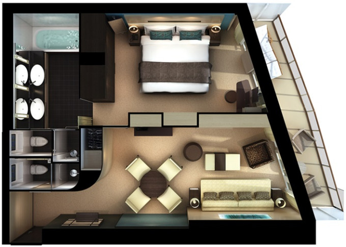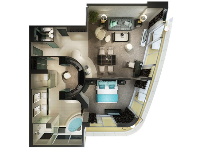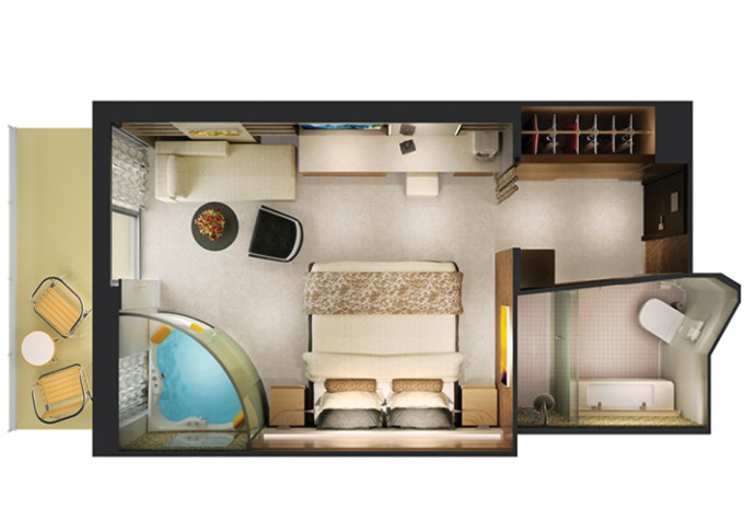 M1 - Club Suite Aft-facing 47-54 m² / balkón 19-25 m². 10. paluba - vpredu.Max 2 osoby. Výhody Club. 1 204 € 602 € za osobu