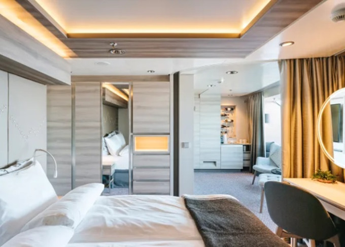 | ME - Expedition Suite s balkónom 22-28 m². Balkón. TV, minibar, varná kanvica, kávovar, župany. Max 4 osoby. Horná paluba. Výhody Suite. | 22 706 € 11 353 € za osobu | ||
