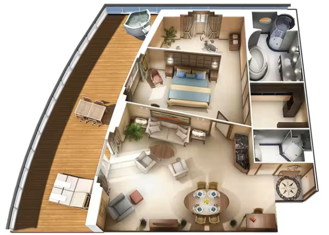 | OS - Owner’s Suite 123 m² + balkón s vírivkou od 62 m². 8. až 10. paluba vzadu. Max 2-3 osoby. 4 izby: vstupná hala s pianom, spálňa, veľká obývacia miestnosť s jedálenskou časťou, 2 kúpeľne (1 s vírivkou), 2 šatníky. Výhody Owners Suite. | 32 458 € 16 229 € za osobu |