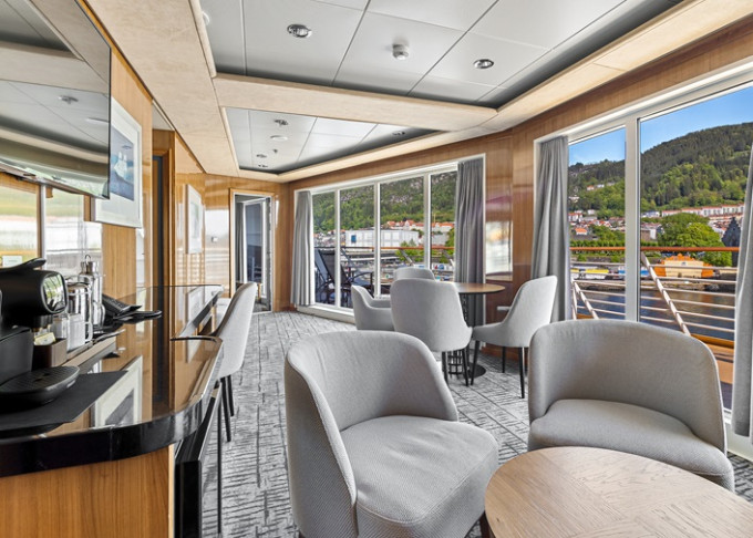MX - Expedition Owners Suite s balkónom 43-45 m². Balkón, oddelená spálňa, obývacia časť, TV, varná kanvica, minibar, internet. 8. paluba. Max 2 osoby. Výhody Suite. 16 812 € 8 406 € za osobu