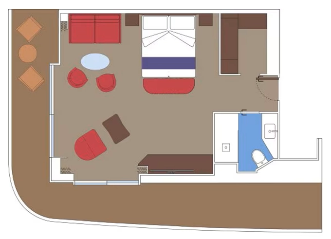 | SLP - Premium Suite Aurea Promenade & Ocean View 27 m² + balkón 9 m² s výhľadom na promenádu a na more. 11. paluba. Cenový model Aure | 3 983 € 3 983 € za osobu |