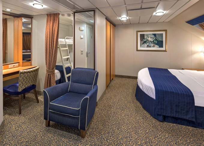 | 1K - Veľká vonkajšia kajuta Ultra Spacious 24,5 m². Neotvárateľné okno. Oddelená časť s poschodovou posteľou. Max. 5-6 osôb. | 3 692 € 923 € za osobu |