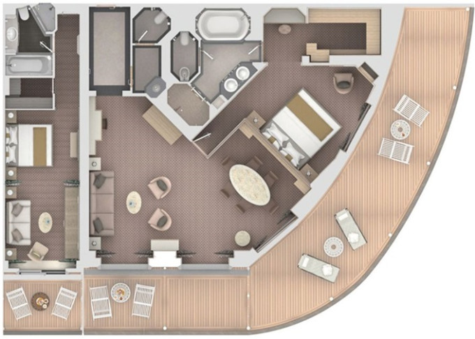 | O2 - Owner's Suite 2 119 - 129 m² (vrátane balkóna 12 m²). Owners Suite S1 spojená s Panorama Suite PA 9. paluba - stred. Max 5 osôb. | 51 400 € 51 400 € za osobu |