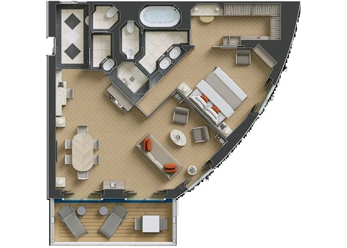 | R1 - Royal Suite 1 105 m² (vrátane balkónu). 7. paluba vpredu. Max 3 osoby. | 45 300 € 15 100 € za osobu | ||