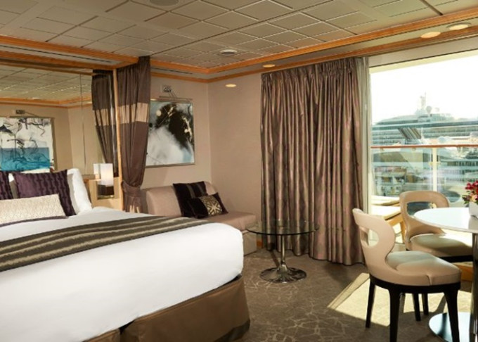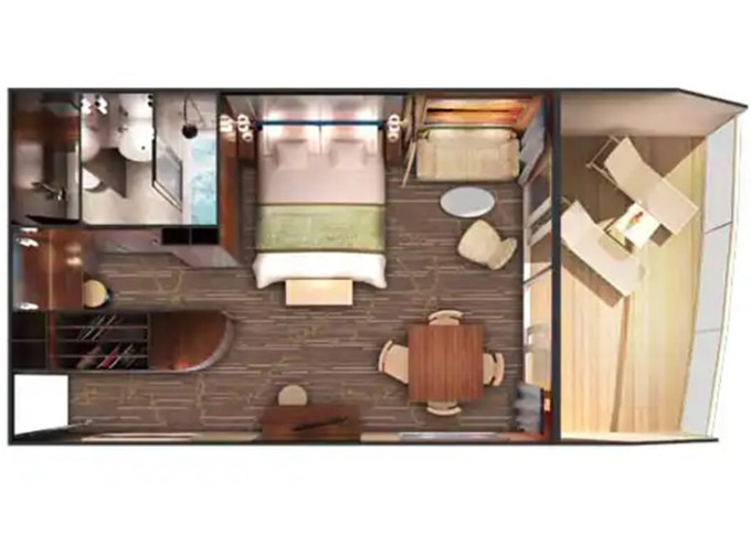 | SN - Aft-facing Penthouse Suite 32-34 m² / balkón 5-7 m². 8,9. paluba - vzadu. Max 3 osoby. Výhody Suite. | 7 738 € 3 869 € za osobu |