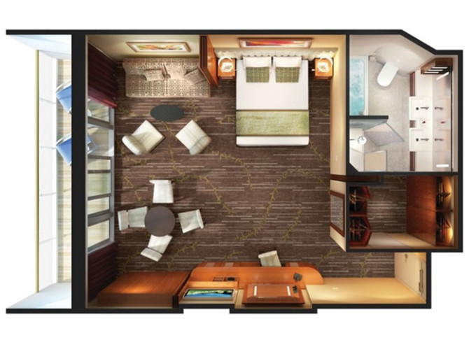 | S6 - Deluxe Owner's Suite 61-68 m². Celoplošné neotvárateľné okná. 12. paluba - vpredu. Max 4-6 osôb. Výhody Suite. | 5 918 € 2 959 € za osobu | ||