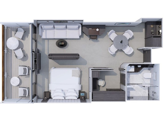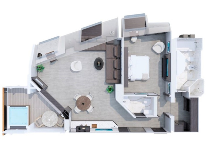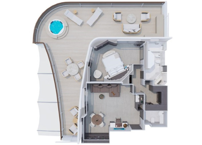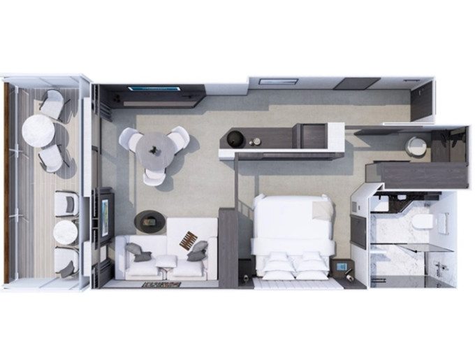 | Ocean Residence - Cove Residence Suita 56 m² + Terasa s vírivkou, sedením a pohovkou alebo lehátkami 14 m² / 6. paluba: 24 m². Spálňa s obývacou a jedálenskou časťou, šatník. Koktailová súprava, minibar, kávovar, vodná kanvica, ďalekohľad, sejf, kúpeľňa so sprchou. Závesy, svetlo, klimatizácia ovládané smart technológiou. Taška Technogym Case Kit. Fľaša šampanského na privítanie. Maximálna kapacita 3 osoby. | 44 172 € 11 043 € za osobu |