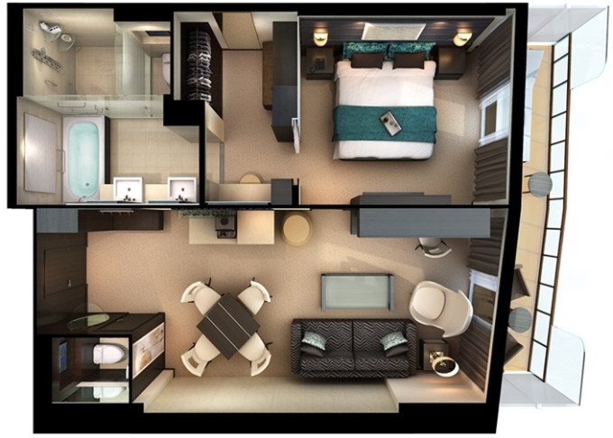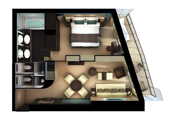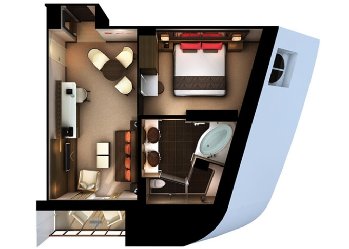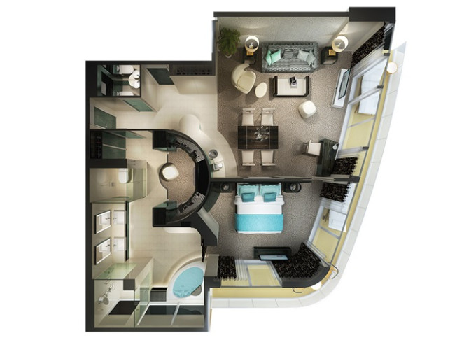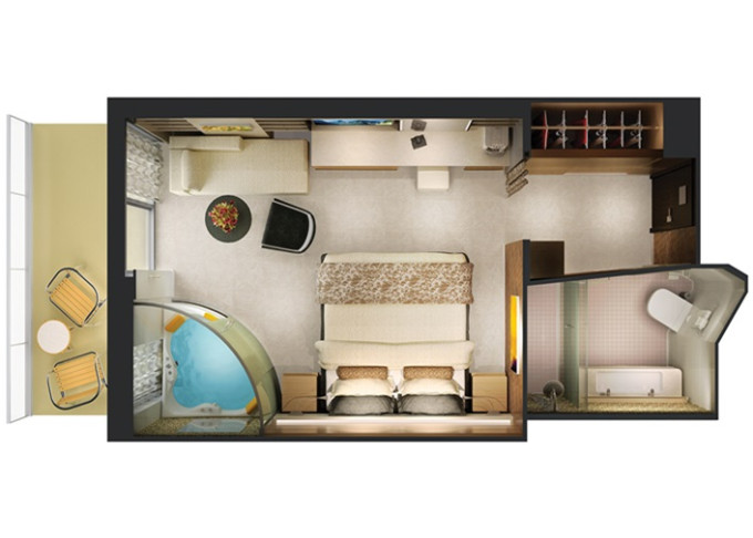 M1 - Club Suite Aft-facing 47-54 m² / balkón 19-26 m². 10. paluba vzadu. Max 2 osoby. Výhody Club. 5 242 € 2 621 € za osobu