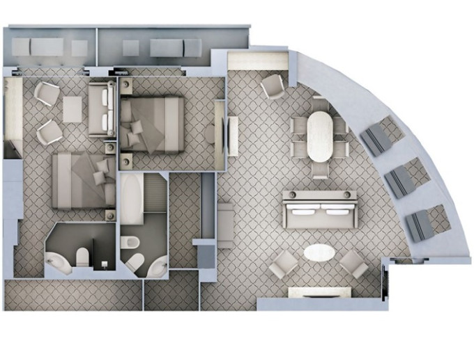 | R2 - Royal Suite 2 96 m² (vrátane 2 balkónov 16,5 m² spolu). 6. paluba. Max 6 osôb. | 114 900 € 38 300 € za osobu |