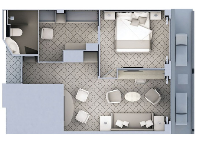 | R1 - Royal Suite 1 69 m² (vrátane balkóna 12 m²). 6. paluba. Max 3 osoby. | 75 300 € 25 100 € za osobu | ||