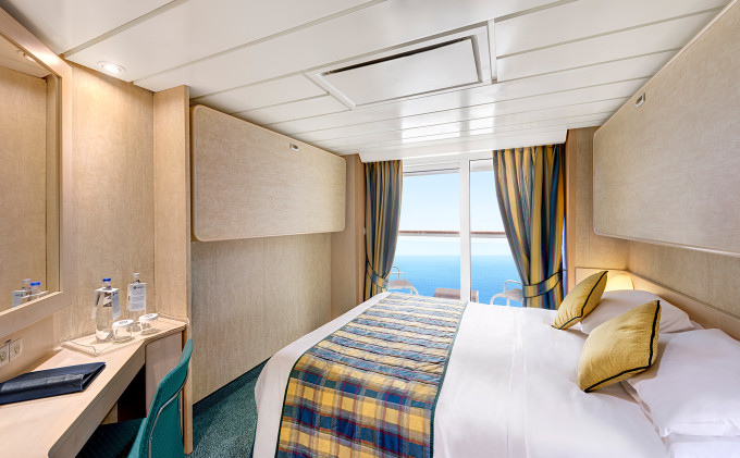 Vonkajšia s balkónom: 15-16m², kajuta s manželskou posteľou (na požiadanie 2 oddelené postele) a rozkladacia pohovka. Klimatizácia, kúpeľňa so sprchou, toaletný stolík, priestorná skriňa, interaktívna TV, telefón, minibar, sejf, sušič na vlasy. Balkón. Internetové pripojenie (za poplatok).