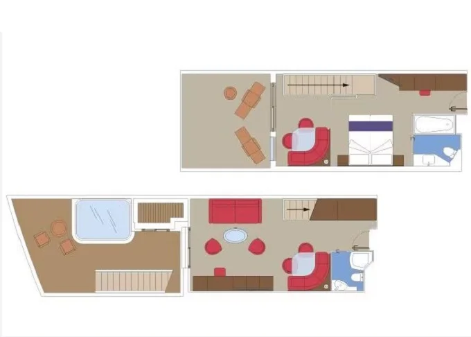 | YJD - Yacht Club Duplex Suite s vírivkou 46 m² + balkón 30 m². Vírivka. 2 podlažia, šatník, 2 kúpeľne (1 s vaňou). Max 4 osoby. 16. paluba. Cenový model MSC Yacht Club. Easy package v cene | 8 242 € 4 121 € za osobu | ||