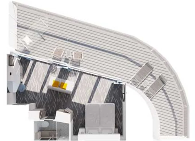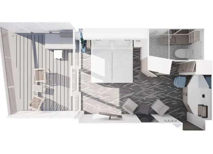 VEKO - Kajuta s terasou 20 m² + balkón 13 m² so stoličkami a váľandou. 15. paluba. Max 2 osoby. 5 882 € 5 882 € za osobu