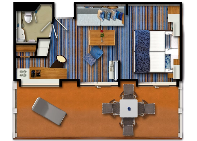 FVDO - Rodinná kajuta Veranda Deluxe 42 m² + balkón 47 m² so stolom, 4 stoličkami a 2 ležadlami. Hracia konzola. 6. paluba. Max 6 osoby. Cenový model PUR 6 798 € 2 266 € za osobu