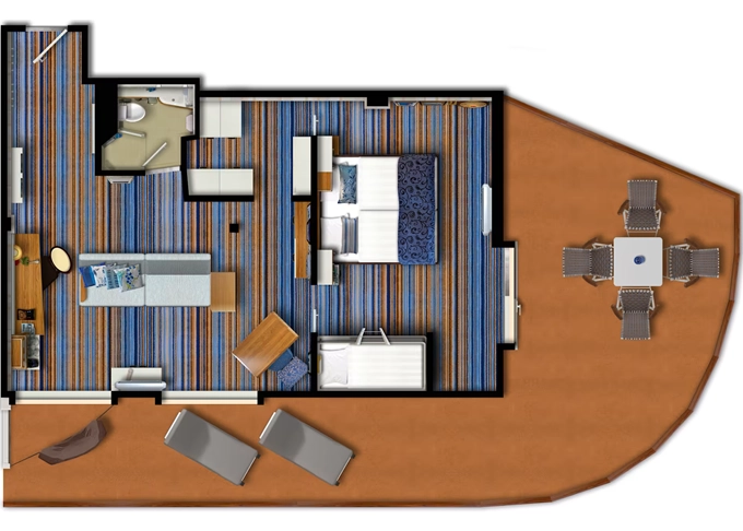 SUTO - Themen Suite 54 m² + balkón 15 m² so stolom, ležadlom a hojdacou sieťou. Spálňa, obývacia časť, šatník. 10. paluba. Max 4 osoby. Výhody Suite. 12 068 € 6 034 € za osobu