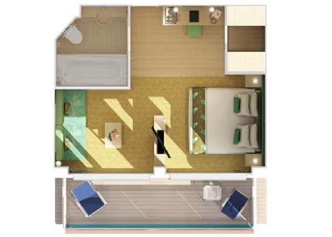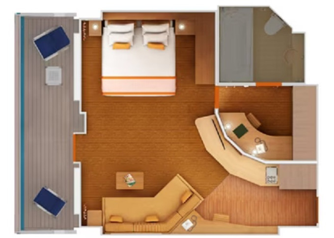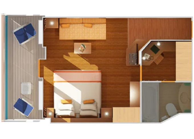 9C - Kajuta s balkónom Premium Vista 21 m² + rohový balkón 7 m². 6,7,8. paluba vzadu. 3 650 € 1 825 € za osobu